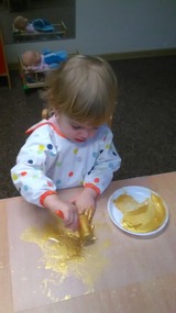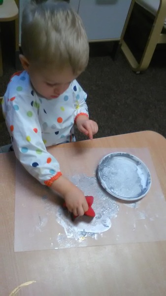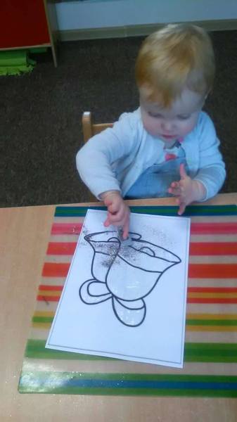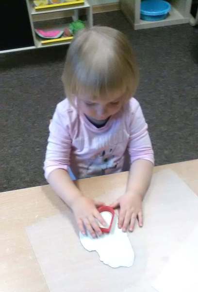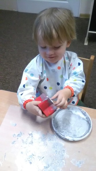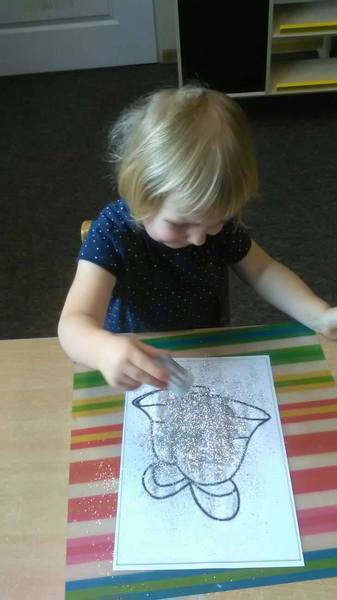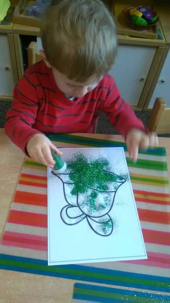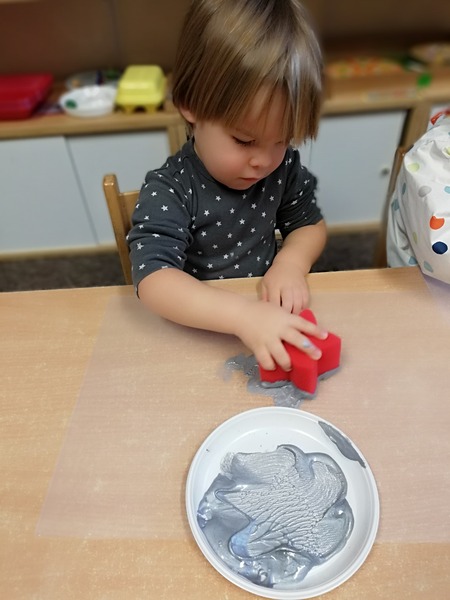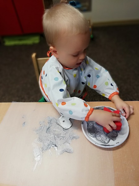 Na zajęciach plastycznych dzieci przygotowywały ozdoby świąteczne. Wycinały z białej gliny gwiazdki, serduszka i bombki, które potem pomalowały za pomocą wałka lub gąbki, złotą bądź srebrną farbą. Ozdabiały również dzwoneczki sypkim brokatem.
