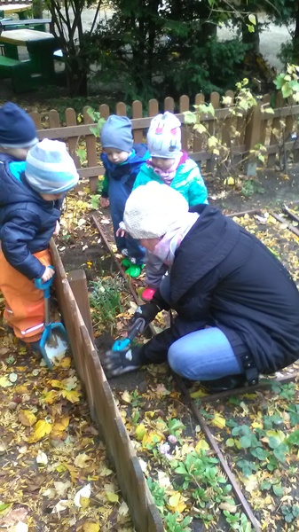Wraz z Panią Kasią dzieci porządkowały przedszkolny ogródek. Aby po raz kolejny cieszyć się pięknem kwiatów wiosną i latem, już teraz trzeba było posadzić cebulki tulipanów. Czekamy do wiosny, by móc poobserwować budzącą się do życia przyrodę.