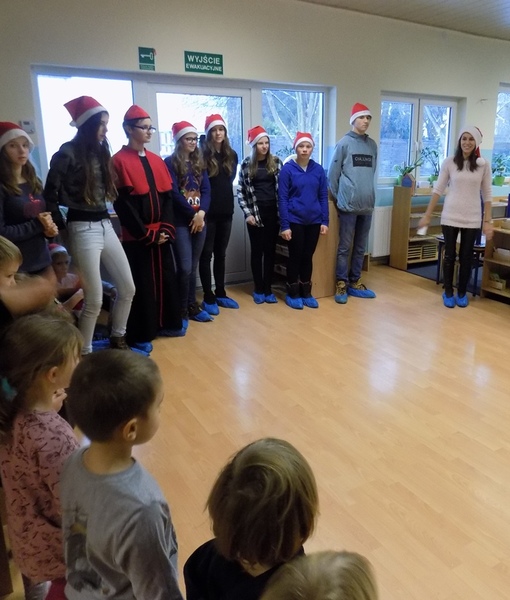 Na początku grudnia nasze przedszkole odwiedzili uczniowie z Gimnazjum Montessori razem z Panią Anią Zalewską. Gimnazjaliści wystawili dla przedszkolaków krótkie przedstawienie opowiadające historię Świętego Mikołaja. Po występie uczniowie z przedszkolakami wymienili się własnoręcznie zrobionymi prezentami.