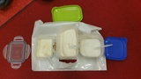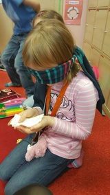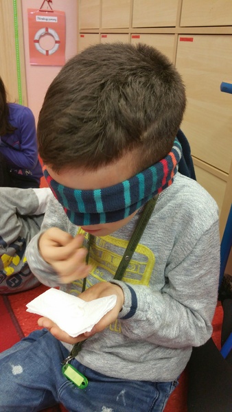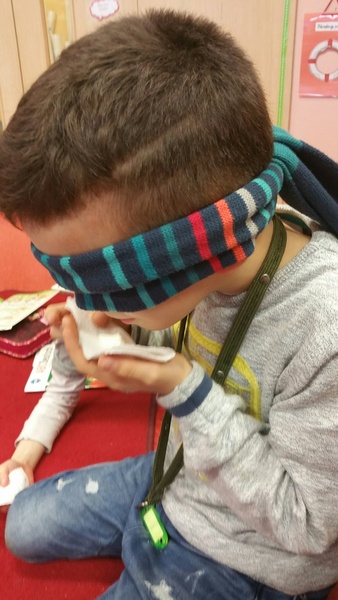 Poznajemy artykuły spożywcze jedynie za pomocą zmysłu smaku i nazywamy je po niemiecku a wszystko dzieje się z zasłoniętymi oczami. Poznane artykuły to:  der Zucker- cukier, das Mehl - mąka, die Sahne - śmietana. Dziękujemy Laurze, że przyniosła artykuły spożywcze.