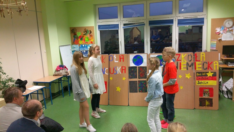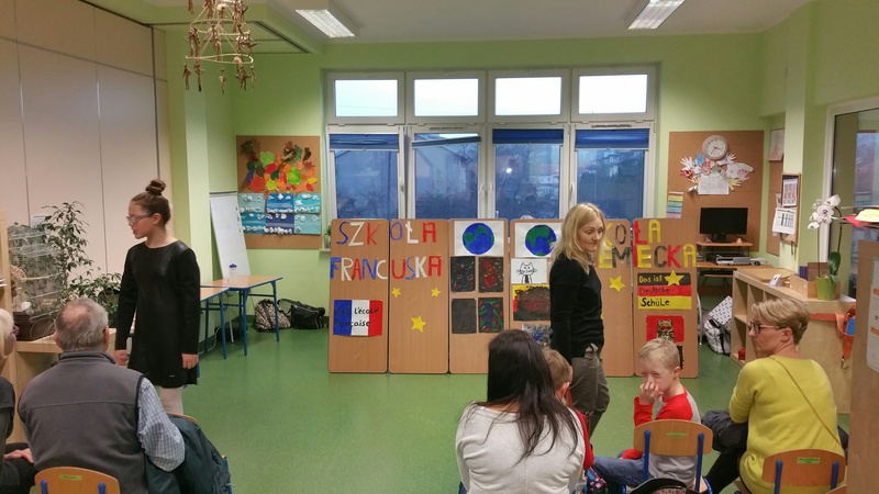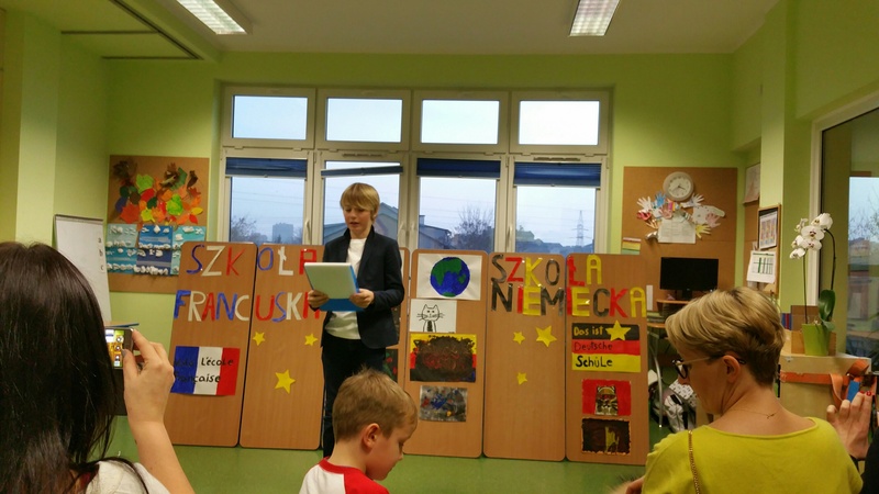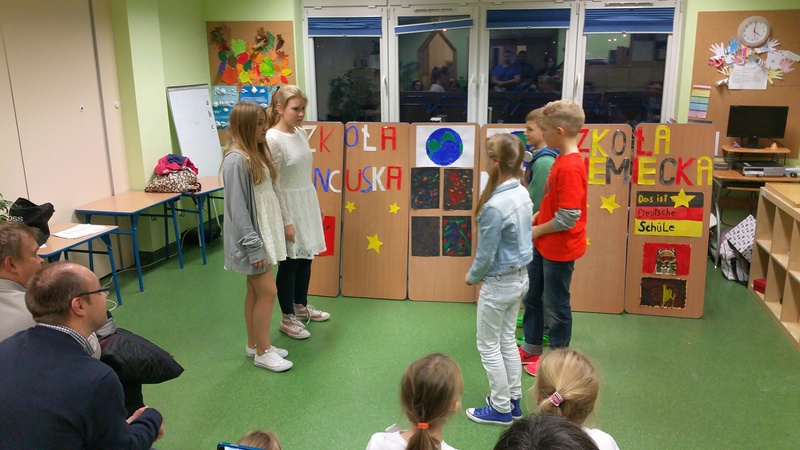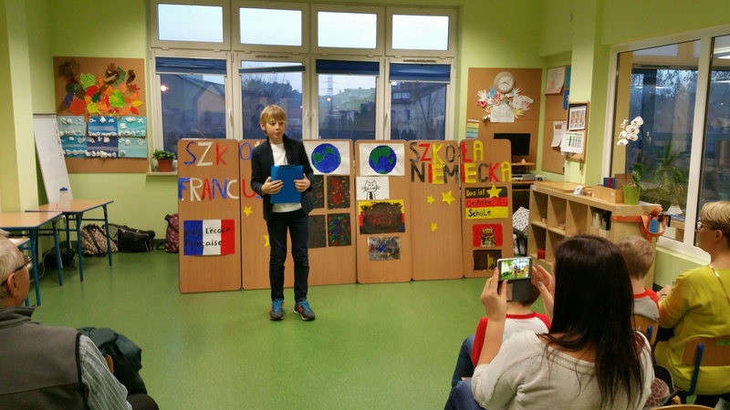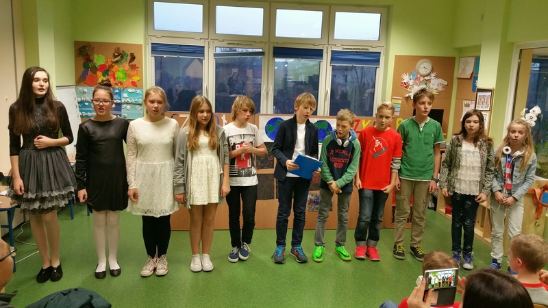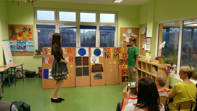 Przedstawienie klas 6 z języka angielskiego, francuskiego oraz niemieckiego. Uczniowie napisali samodzielnie rewelacyjny scenariusz pod czujnym okiem naszych filologów. Grupa francuska posługiwała się językiem francuskim a grupa niemiecka językiem niemieckim. Następnie wszyscy uczniowie porozumiewali się językiem angielskim. Niesamowite efekty bardzo długiej i sumienne pracy. Dzieci mogą być z siebie dumne.